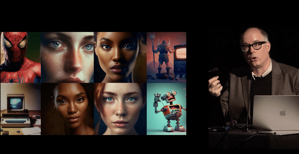 « Je vais aborder une autre question, un autre aspect de cette transforation profonde que nous traversons, c’est à dire la manière dont les technologies dites d’intelligence artificielle appliquées aux images et aux sons sont en train de transformer profondément les relations entre images et mots, entre le visible et le dicible, entre ce qui peut être vu ou visualisé et cequi peut être dit. C’est une transformation profonde qui ne conceme pas seulement le cinéma, mais tout le champ des images fixes et en mouvement. Et donc le champ de la photographie, du cinéma, de l’art contemporain, de la vidéo, de la culture visuelle au sens large. »