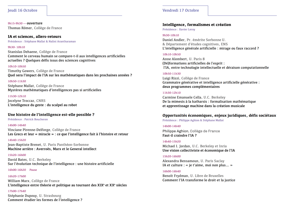 L’essor de l’IA met à l’épreuve sinon les pratiques, du moins les épistémologies de toutes les disciplines. Par ailleurs, cette avancée technologique a des répercussions politiques, économiques et sociales si puissantes (et si imprévisibles) qu’elle amène le Collège de France à retrouver sa mission première : mettre la science devant la société. Voici donc ce qui justifie d’y consacrer le colloque de rentrée de cette année, dans une optique résolument interdisciplinaire. Il ne s’agit nullement de faire catalogue, ou étalage, de tout ce que les sciences attendent ou craignent de l’IA, en demeurant dans le registre des usages. On ne cherchera donc pas à répliquer les initiatives nombreuses, qu’elles soient publiques ou institutionnelles, que l’IA suscite aujourd’hui. On proposera au contraire de rassembler les réflexions autour d’une question centrale : comment les mutations actuelles de l’IA peuvent-elles se nouer avec la compréhension, en longue durée, de l’idée que l’on se fait des formes de l’intelligence – c’est-à-dire, plus précisément, des rapports entre apprentissage, connaissance et déduction ?