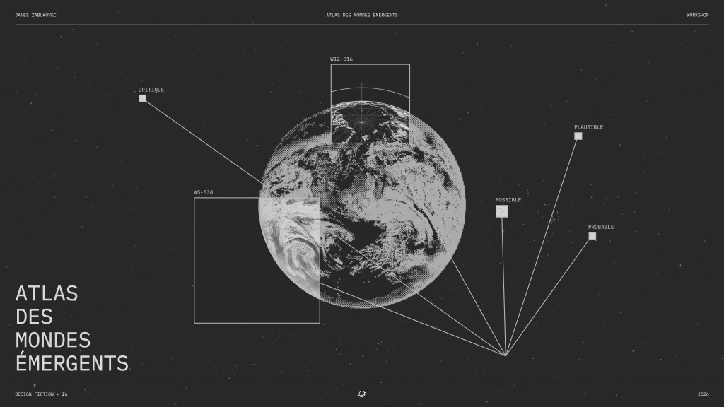 Comment s’approprier ces outils pour produire des visions singulières, incarnées, critiques ? C’est à cette question que le workshop Atlas des Mondes Émergents tente de répondre, en s’appuyant sur les méthodes du design fiction (Dunne & Raby, 2013 ; Bleecker, 2022 ; Voros, 2003) et sur l’intelligence artificielle générative comme terrain d’expérimentation.