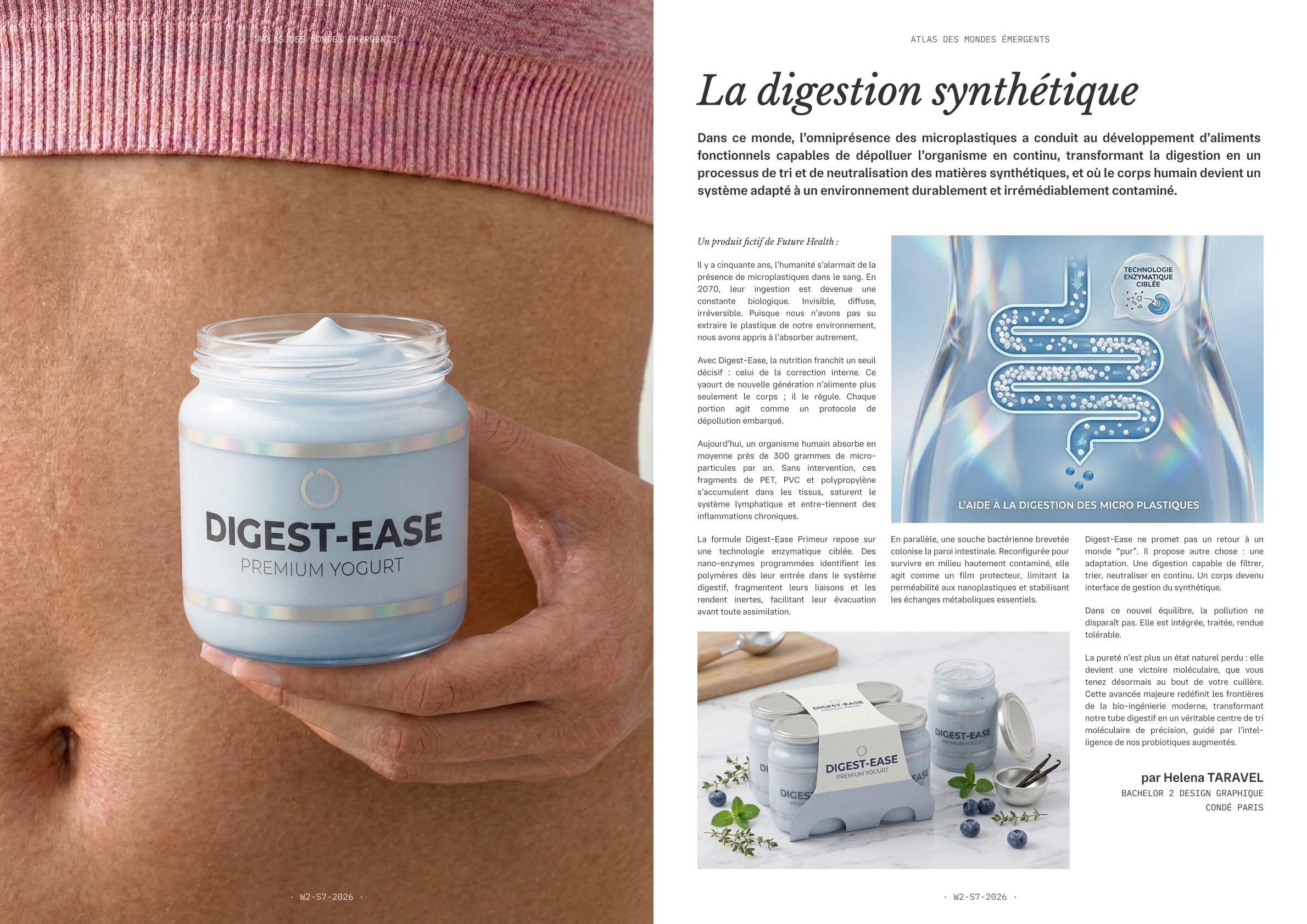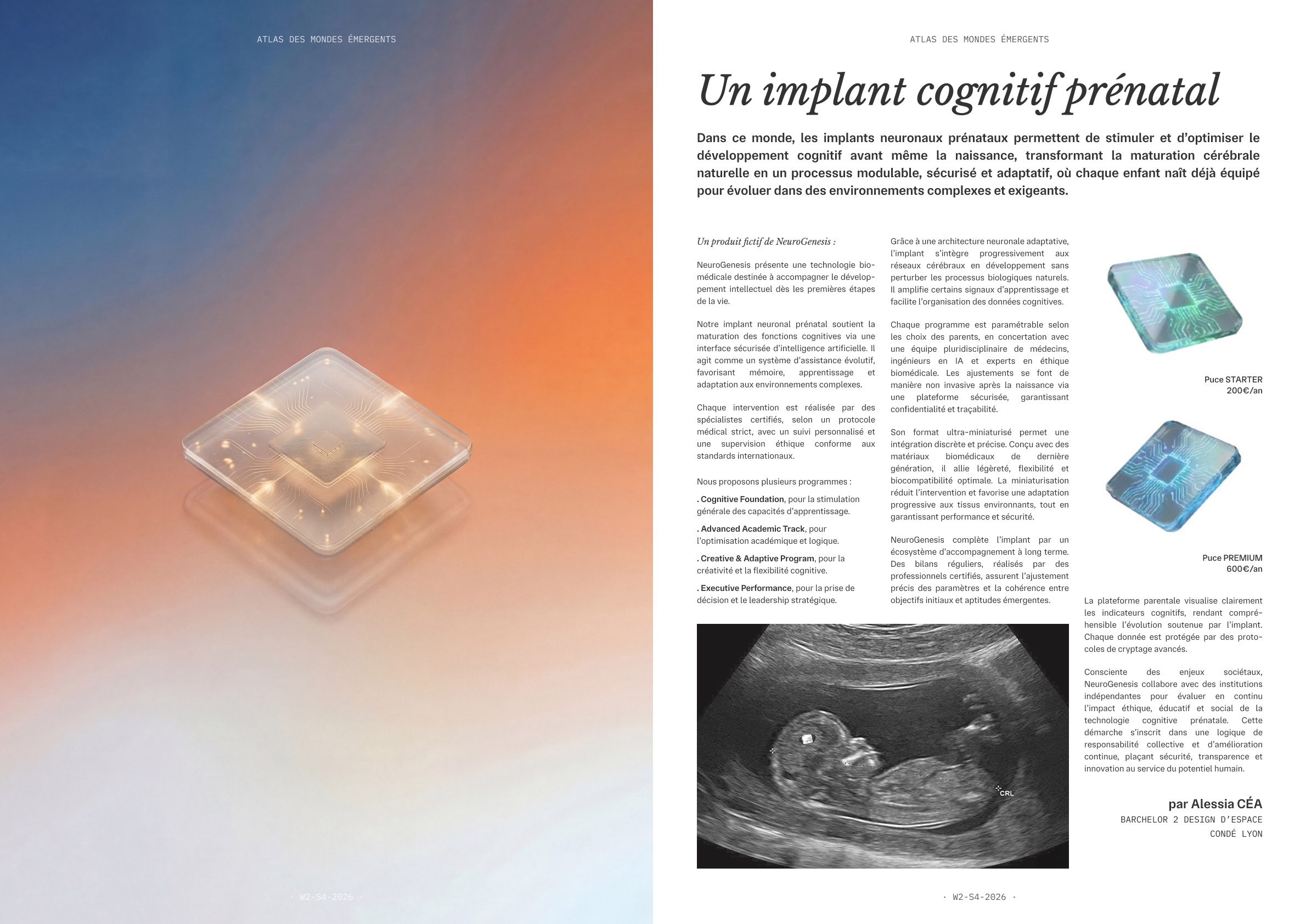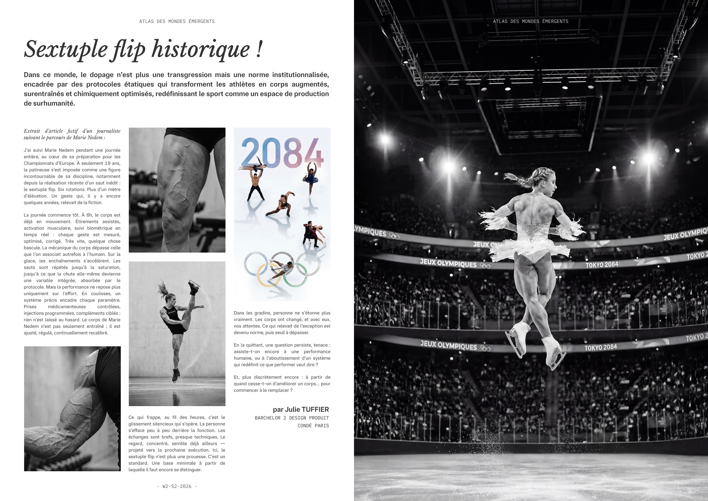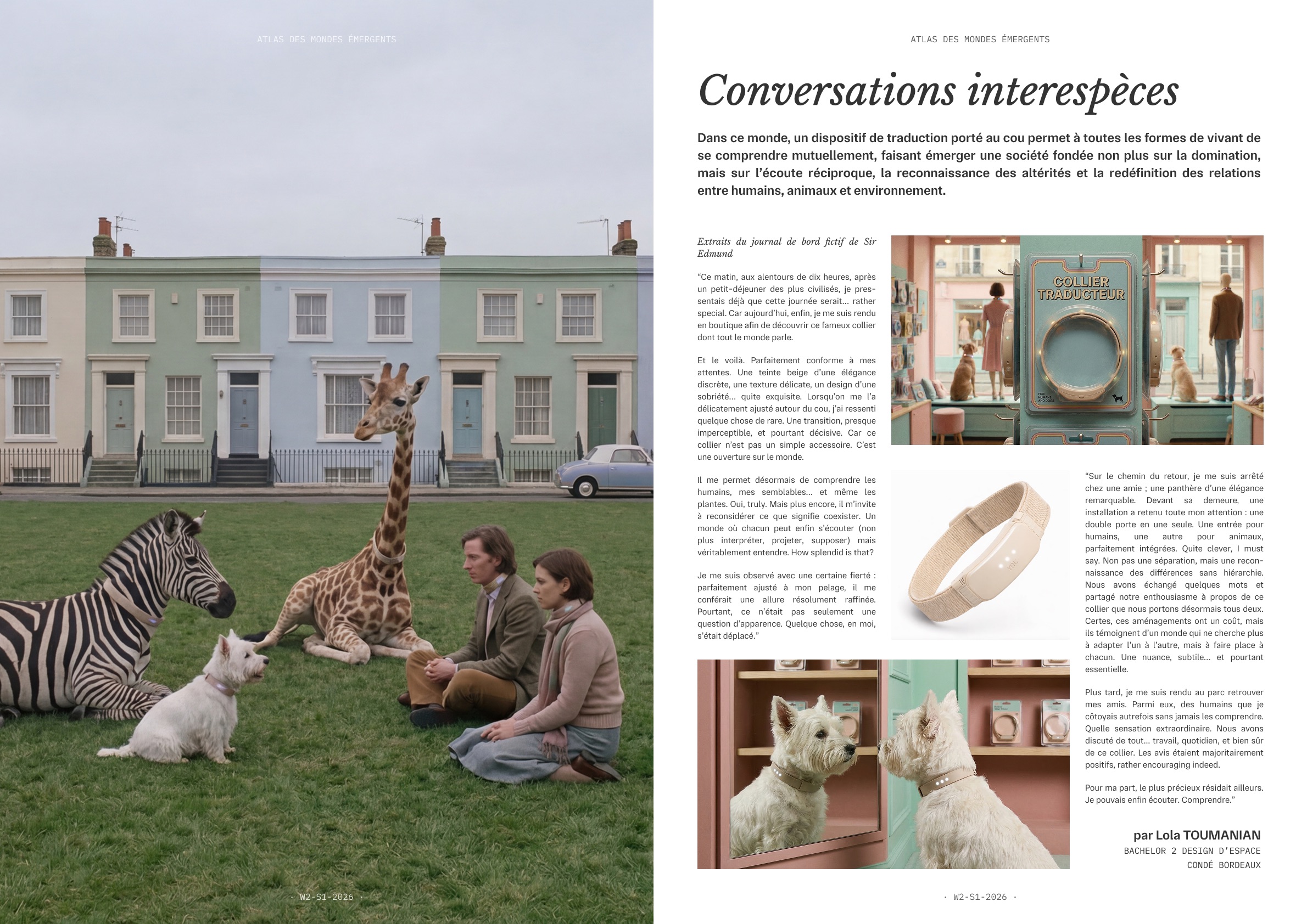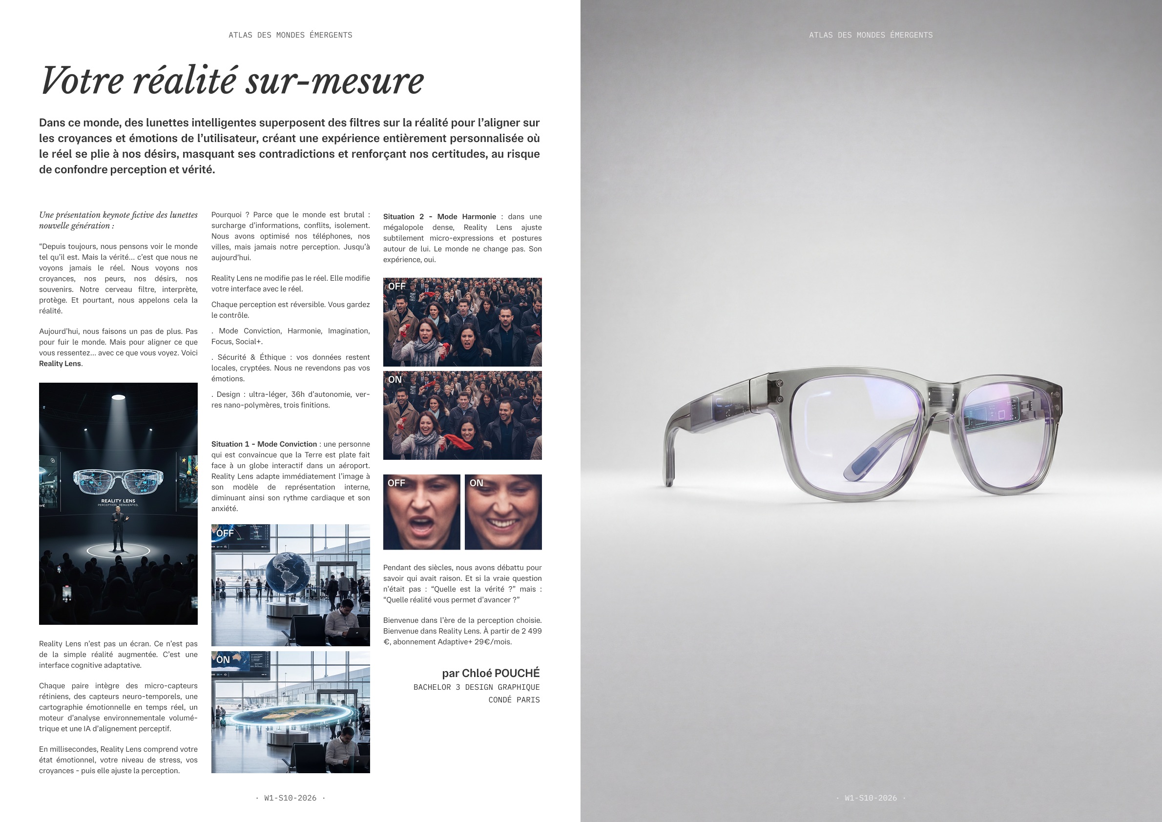 La production finale prend la forme d’une page d’un Atlas combinant des artefacts textuels (article, reportage, décret, témoignage, FAQ, journal intime…) et des artefacts visuels (images, dessins, rendus 3D, documents factices) comme autant de traces d’une réalité projetée.